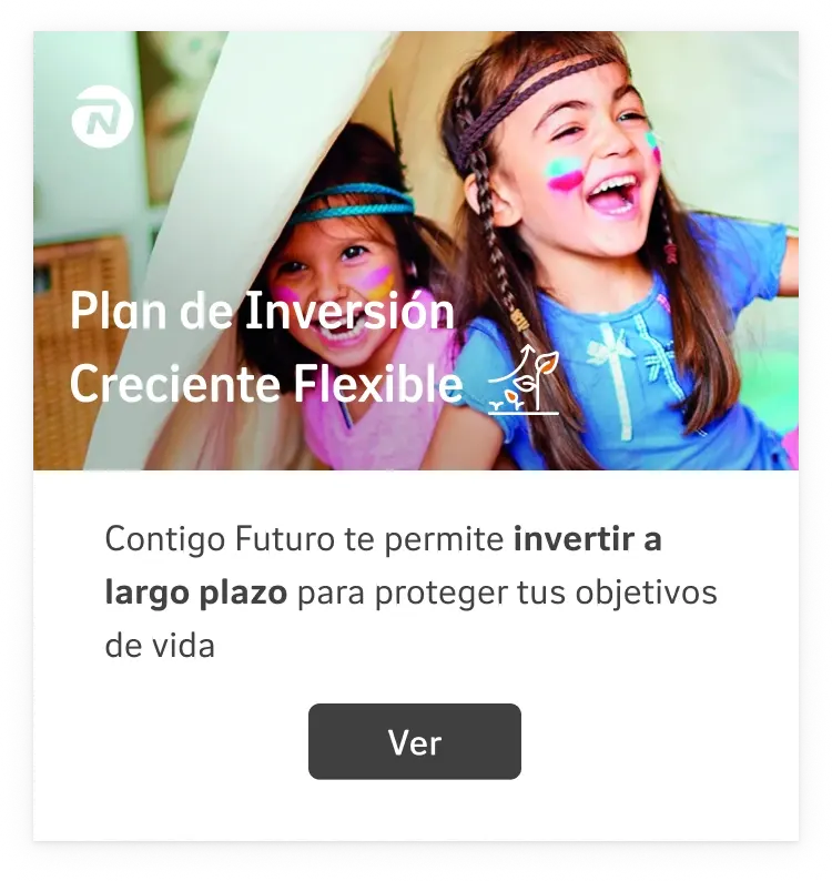 Con Contigo Futuro disfrutarás de un plan de inversión a largo plazo. Una inversión responsable y flexible que está siempre disponible para ti, con coberturas que te protegen y con la ventaja de que te ayuda a ahorrar para conseguir tus metas.